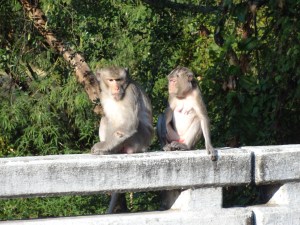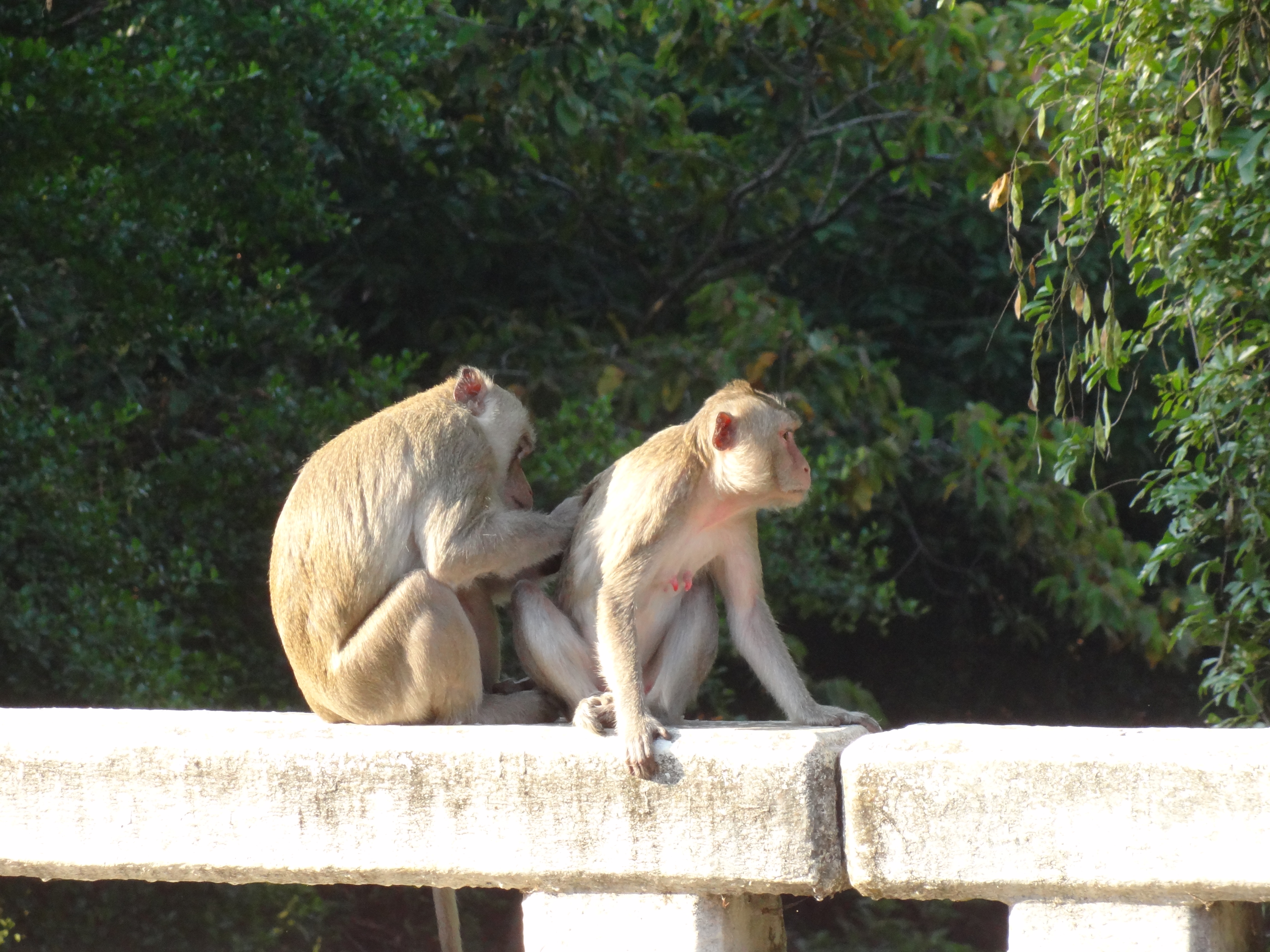 It’s easy keeping an eye on the monkeys because I cycle past Don Chao Poo and Don Jik every day. I sometimes get to Don Jik before the monkeys have come down from the trees, but more often when I get to the bridge there are at least a few of them there. One day I counted 20 of them but usually I only see about half that number. In Don Chao Poo there are 400, 500, 600 perhaps, and the sheer size of that colony may be why my visits to Don Jik often reveal more intimate moments.
