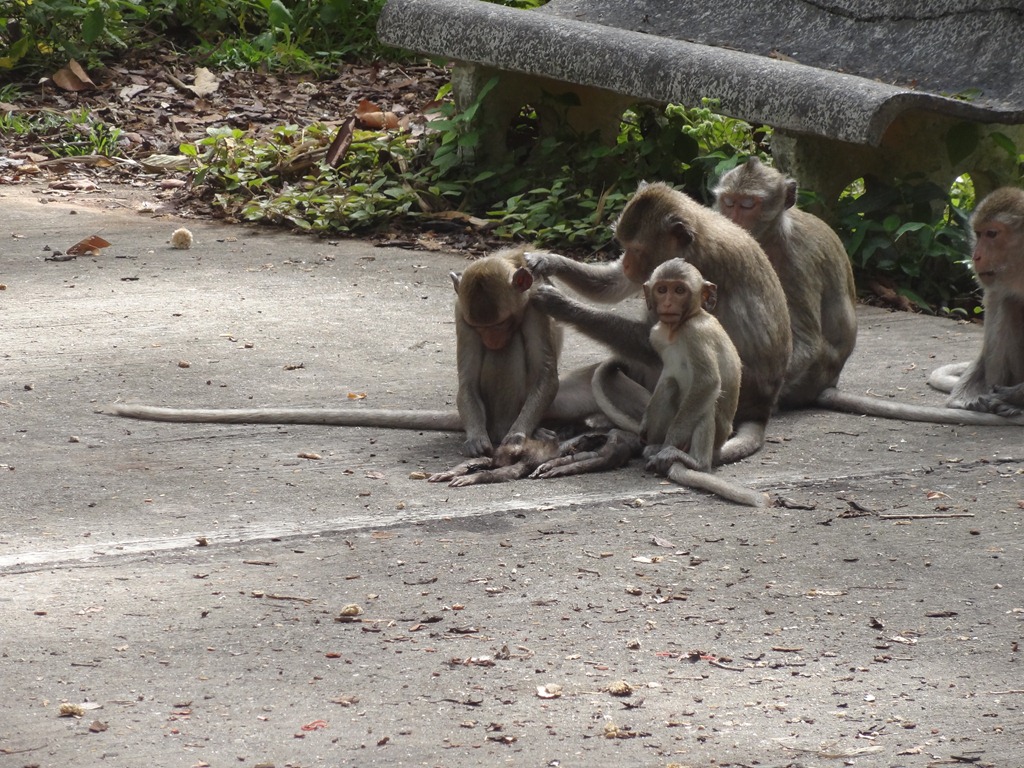 I assume that the monkey receiving the grooming was a female since it was adult and so unlikely to be allowed in the group if it was male. The low body position in the first shot suggests submission, since it doesn’t look at all comfortable, and the bowed head in the second shot also looks as if this monkey is unhappy – but perhaps I am just applying a human judgment here. This position is repeated in the following sequential shots.