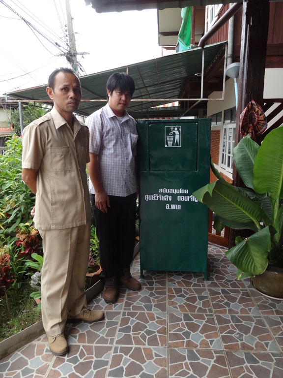 Phana District Hospital has had to confront the issue of monkeys raiding their rubbish bins and of course this is particularly important for a hospital which has some waste material that is potentially dangerous. So we turned to the hospital for help and the engineers there came up with this prototype for us and delivered it to the Research Centre.
