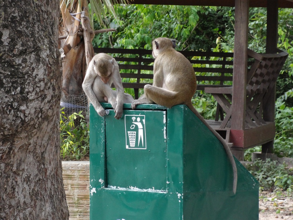 Only male monkeys were at all interested in the bin and the second only climbed onto the bin when he was sure the first was no longer interested. The third monkey you see climbing up to join the second one was almost certainly a sibling and trusted by the older monkey. Several younger monkeys were chased away.