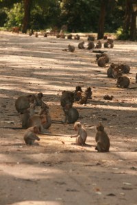 After being slightly overwhelmed upon our arrival by the sheer number of monkeys that were resident in the small forest, we decided the first course of action was to determine just how many there were and carry out a population census. But how do you get an accurate representation of a species that spends a lot of its time in the trees? – We needed a plan! After a few days of general observations of the monkeys we noticed that when they were provisioned with rice by the local council twice a week, they all sat neatly in a line whilst feeding – this was to provide us a large proportion of the population.