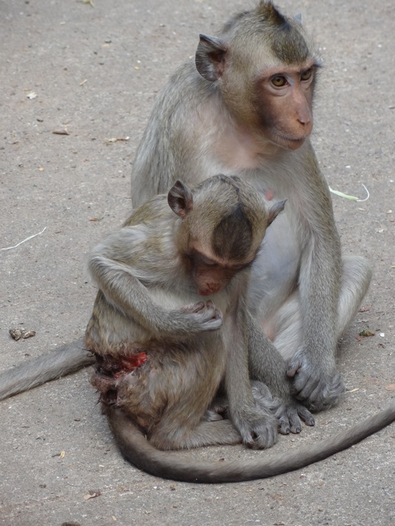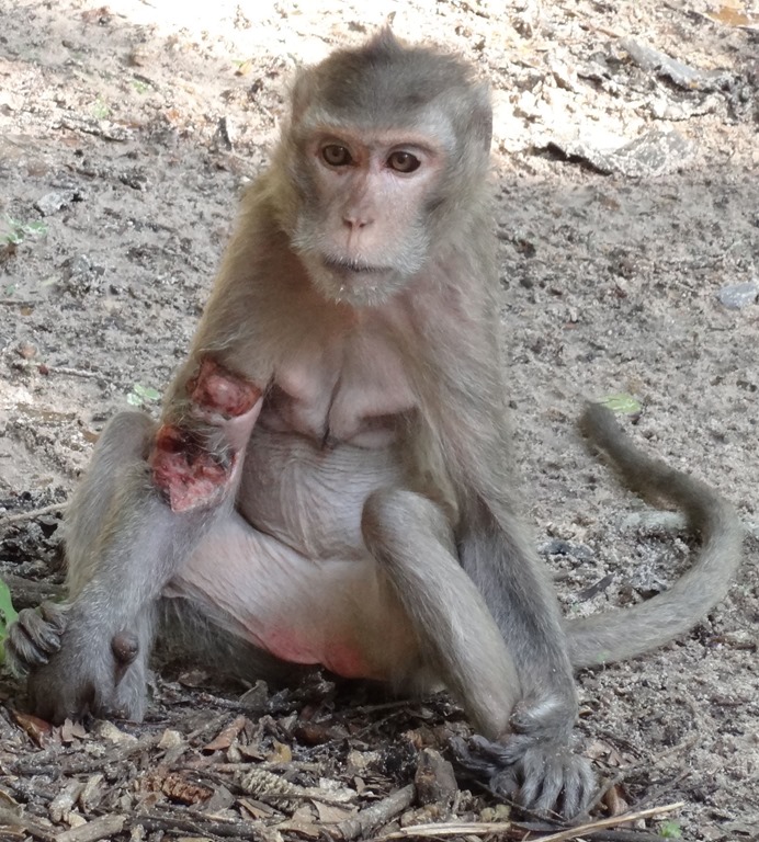 This monkey, on the other hand, does look as if it was severely savaged, and we remember seeing (but not photographing) him much earlier when the wounds were still raw. We had not expected him to survive and now suspect that despite getting to this stage, he did finally succumb. Of all the injured monkeys I have seen, he is the only one which has seemed to communicate pain, as he was doing in the picture on the left.