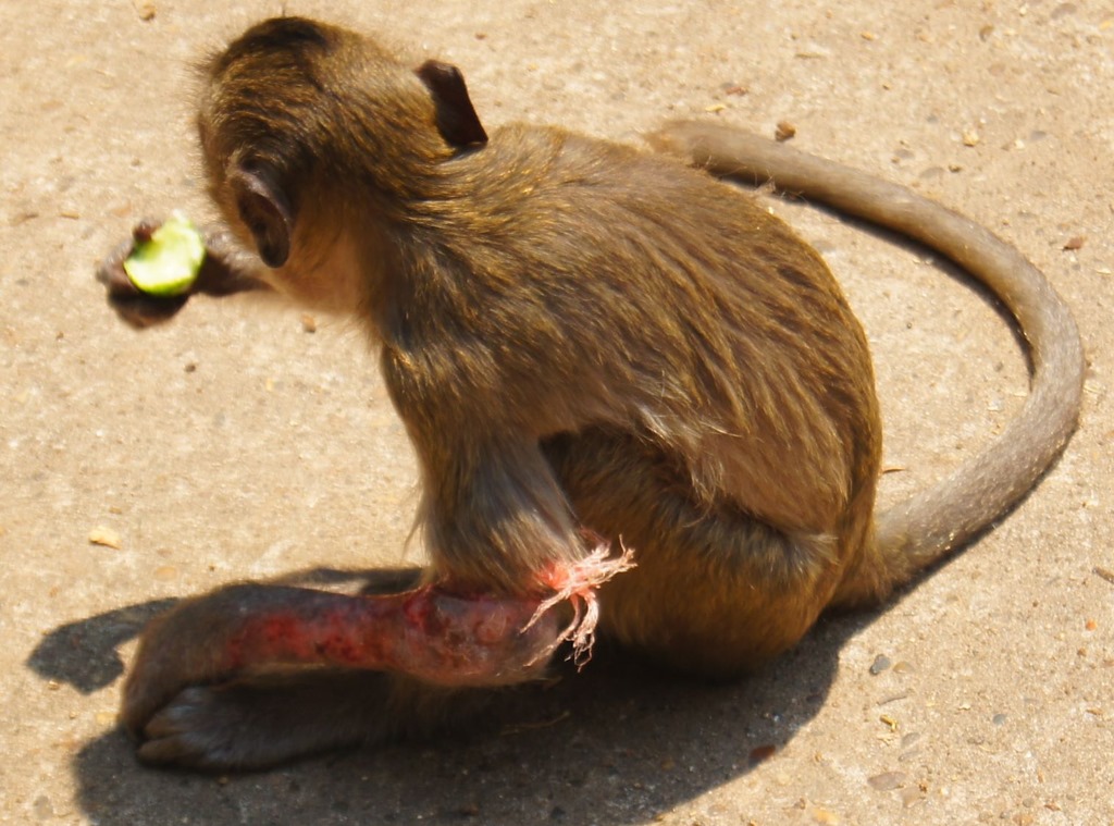 One of our juvenile long-tailed macaques gave us a lot of concern earlier this year. When we first saw him we feared for his life but he quickly showed amazing resilience and we reduced our pessimistic expectations to his losing a limb.