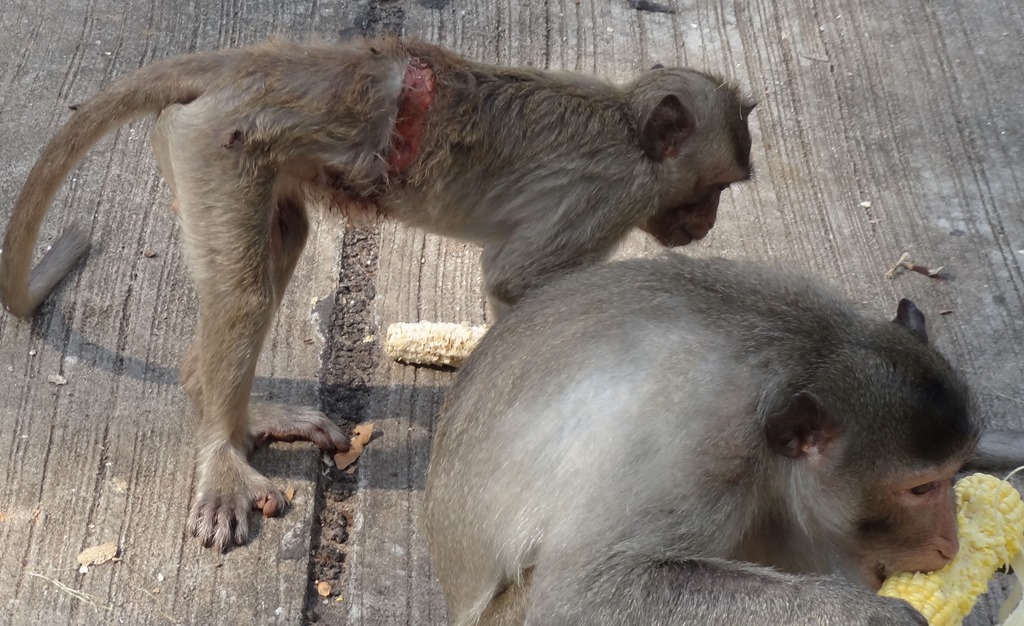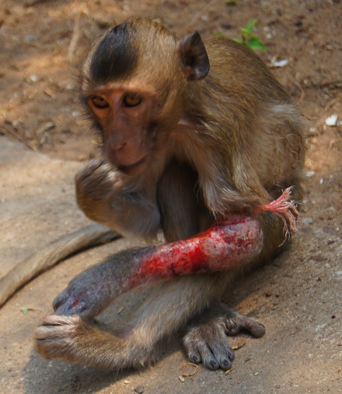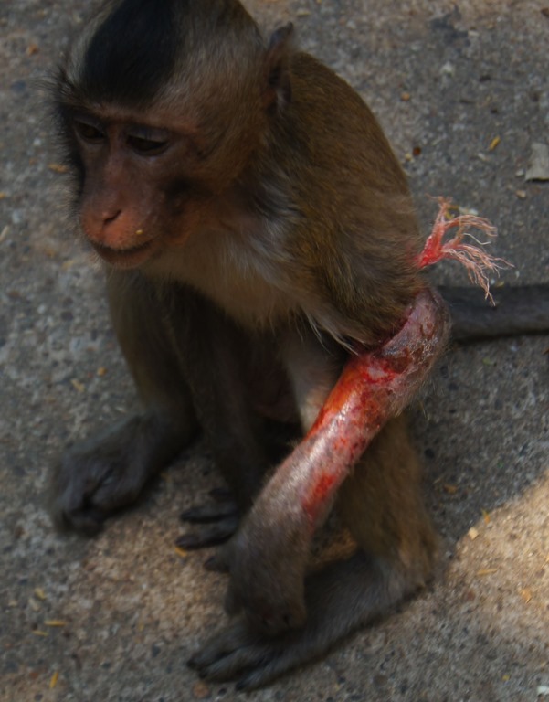 The good news is that both these monkeys have survived though we see them infrequently. The first one still has his injured forearm although it has lost all functionality. As with most animals, long-tailed macaques are able to adapt remarkably well to the most severe injuries if they are lucky enough to survive them.