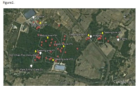 The particular troop selected for the study is one which does not seem to compete openly for the human provisioning which the other three troops seem to rely heavily upon. It is also the troop which has been observed spending time in the grounds of Phana District Hospital, roosting on the edge of the forest adjoining the western perimeter of the hospital.