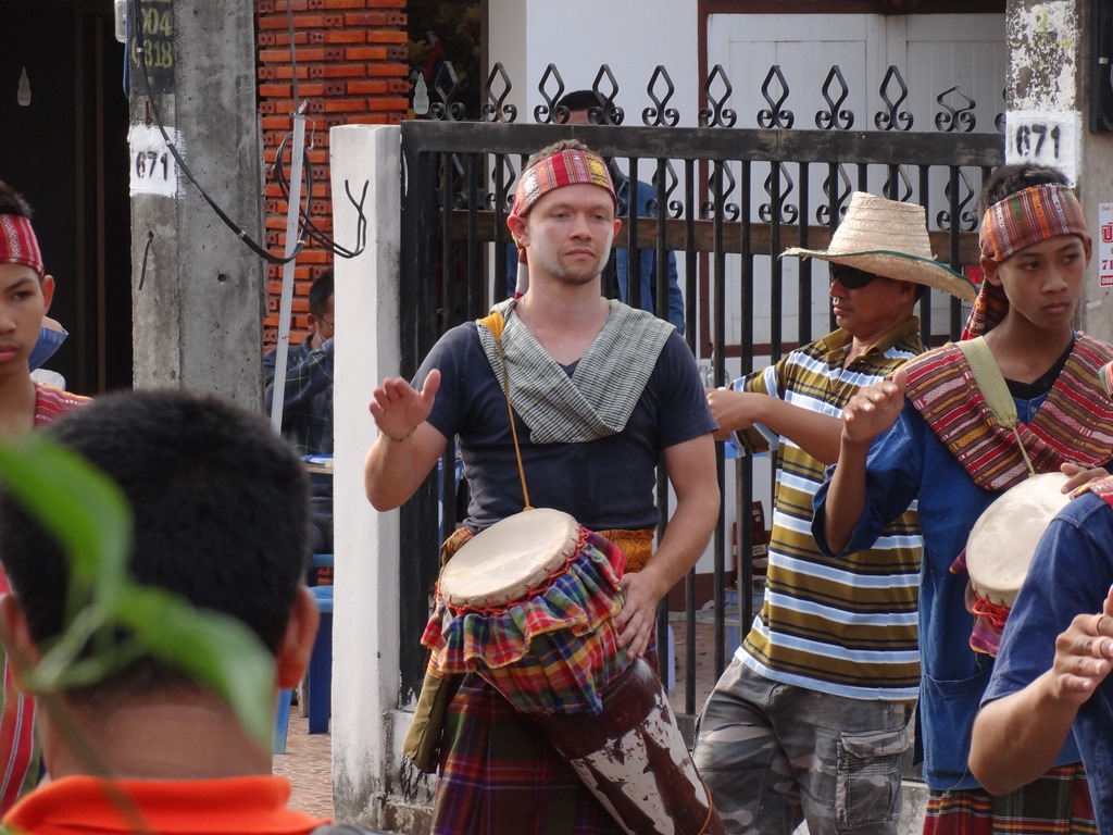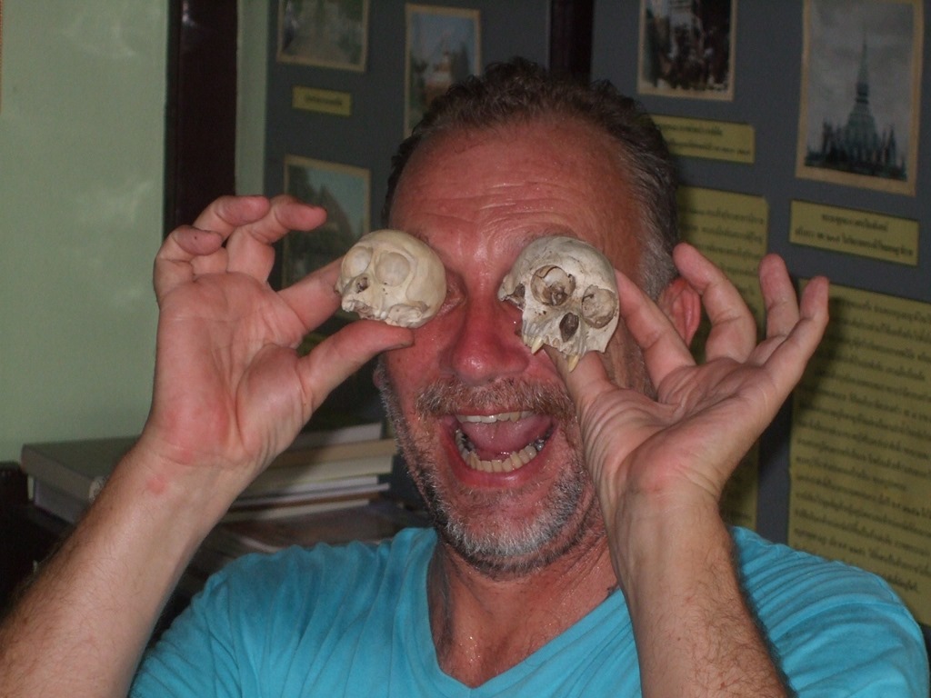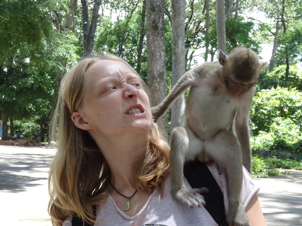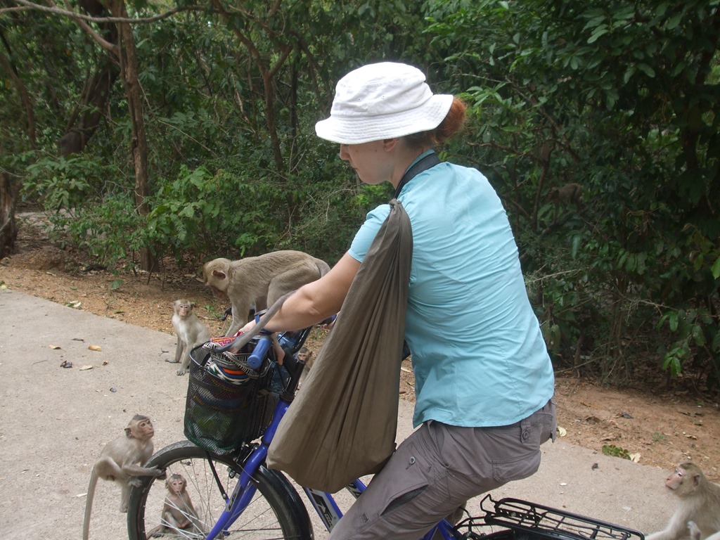Steve and Sarah taught for a month at Ban Muang Sawat Primary school and the local council-run kindergarten, as well as spending time in the forest. It was about this time that a young male monkey got into the habit of climbing on us, not something we encourage but it was difficult to prevent. As 2013 closes we are a little pleased that he seems to have outgrown the habit. Here he is with Sarah, who was well prepared for him: