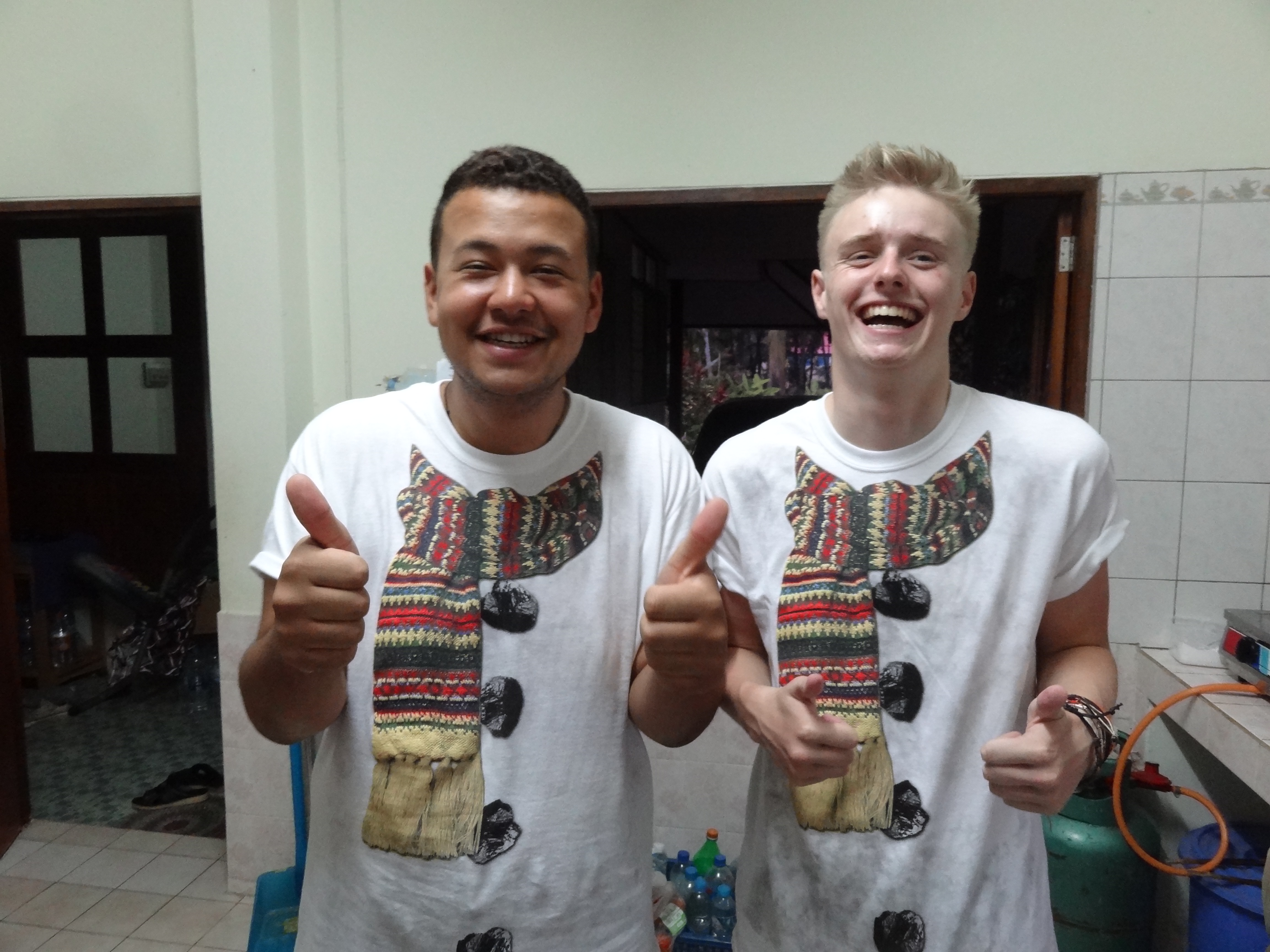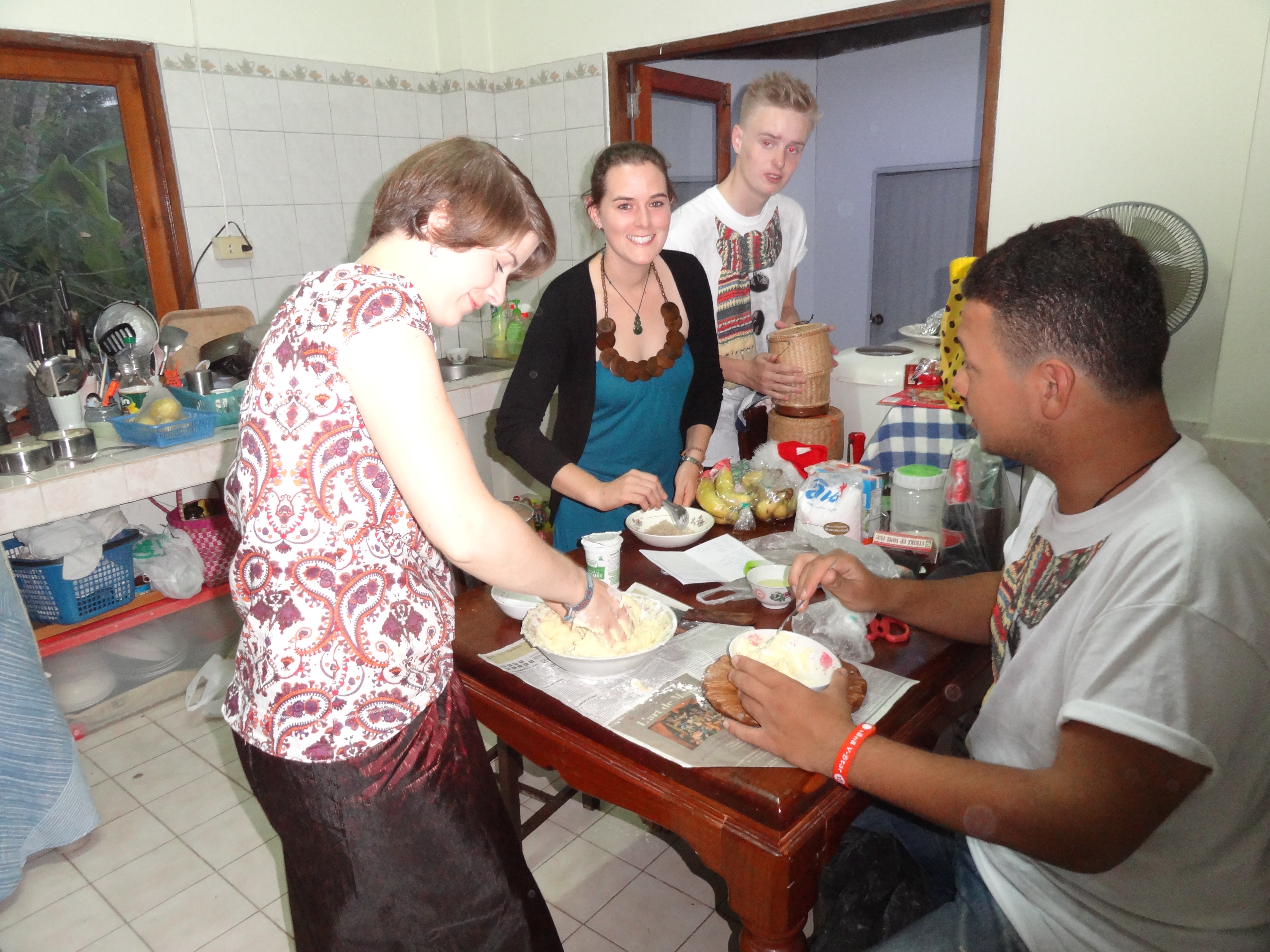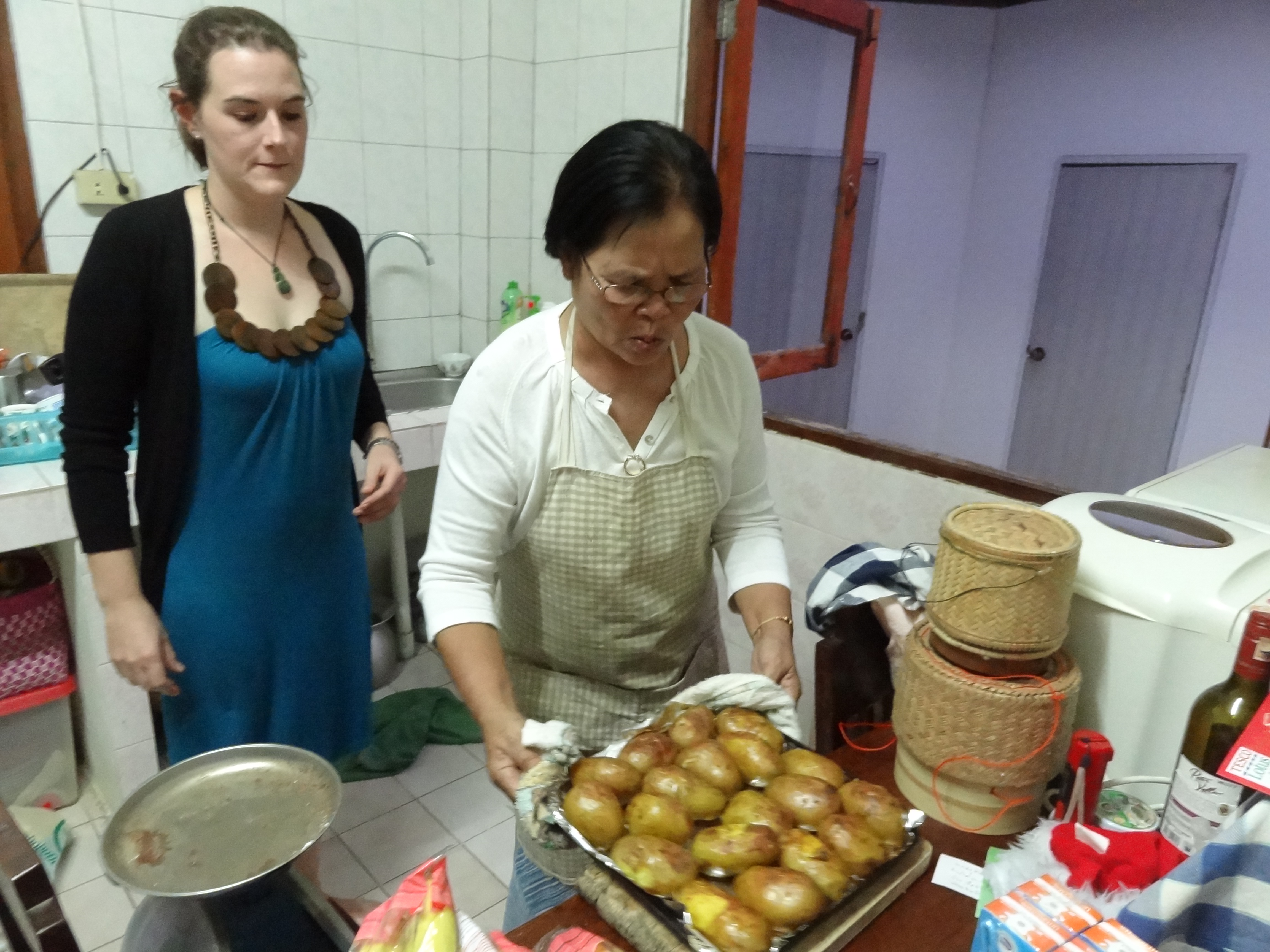 At CHRISTMAS 2013 Pensri and Lawrence were joined at home by Julia, Lydia and Tessa and by the two Project Trust volunteers Cameron and Kevin. The kitchen was very crowded indeed!
