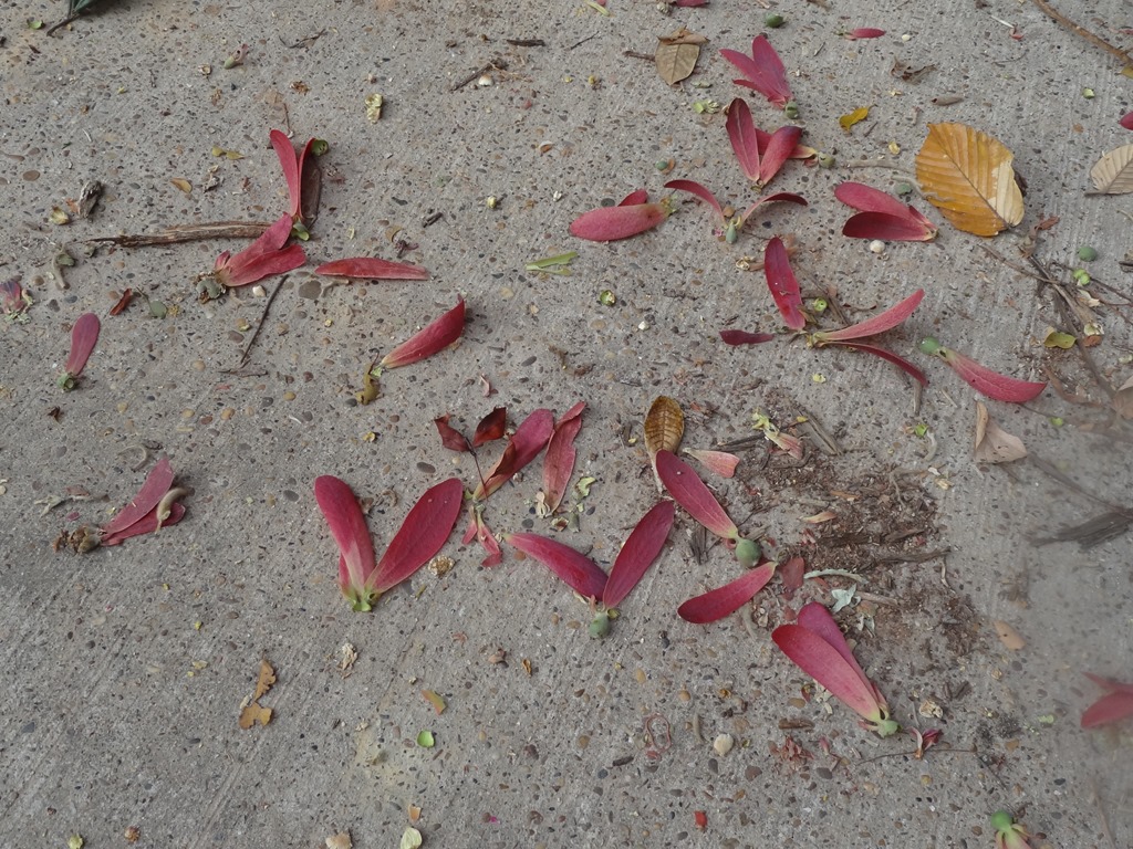 Long-tailed macaques in Don Chao Poo Forest, Phana, have been finding natural food available in the forest since late January. They can be seen foraging on the ground for insects or eating leaves and flowers in the trees. For many, a useful source of food is the seed pods that drop from the tall yang trees (dipterocarpus alatus).