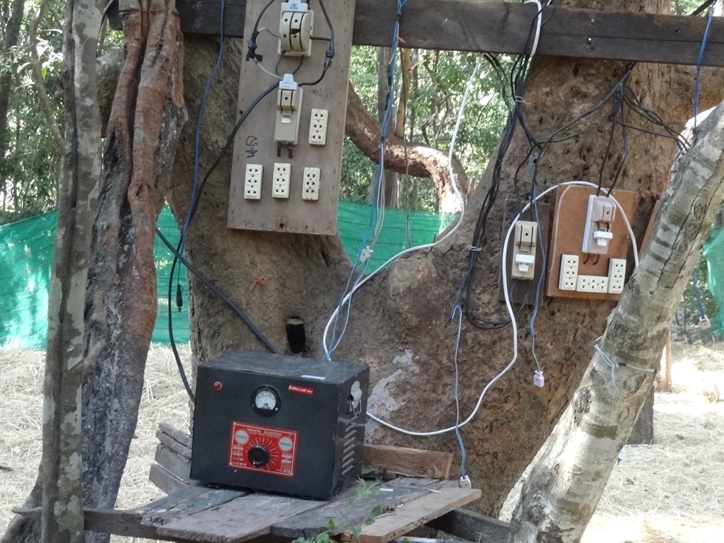 Trees are festooned with electrical wiring and neon lights and here is the control centre: