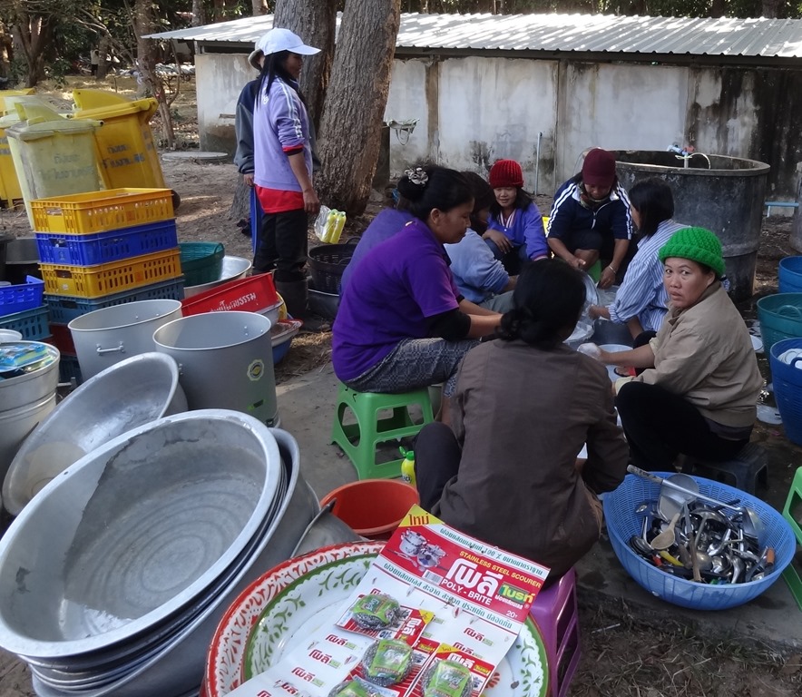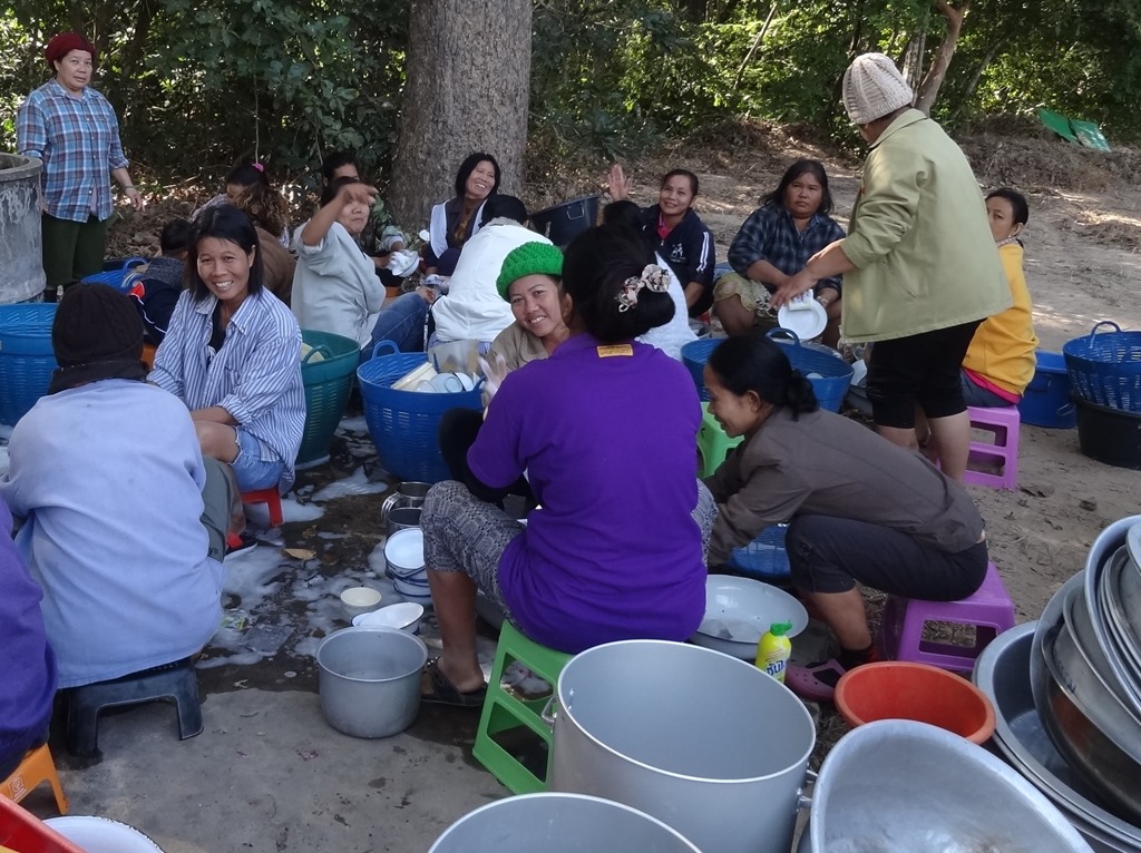 In the run-up to the start of the retreat, perhaps 30 or 40 people are eating in the forest at about 11 am each day. But once the retreat starts, villages will take it in turns to share the responsibility of feeding the monks and lay people who are taking part in the retreat; and when they have eaten, the villagers themselves will eat, breakfast and lunch. And that means that up to 600 people may be eating two meals in the forest every day.