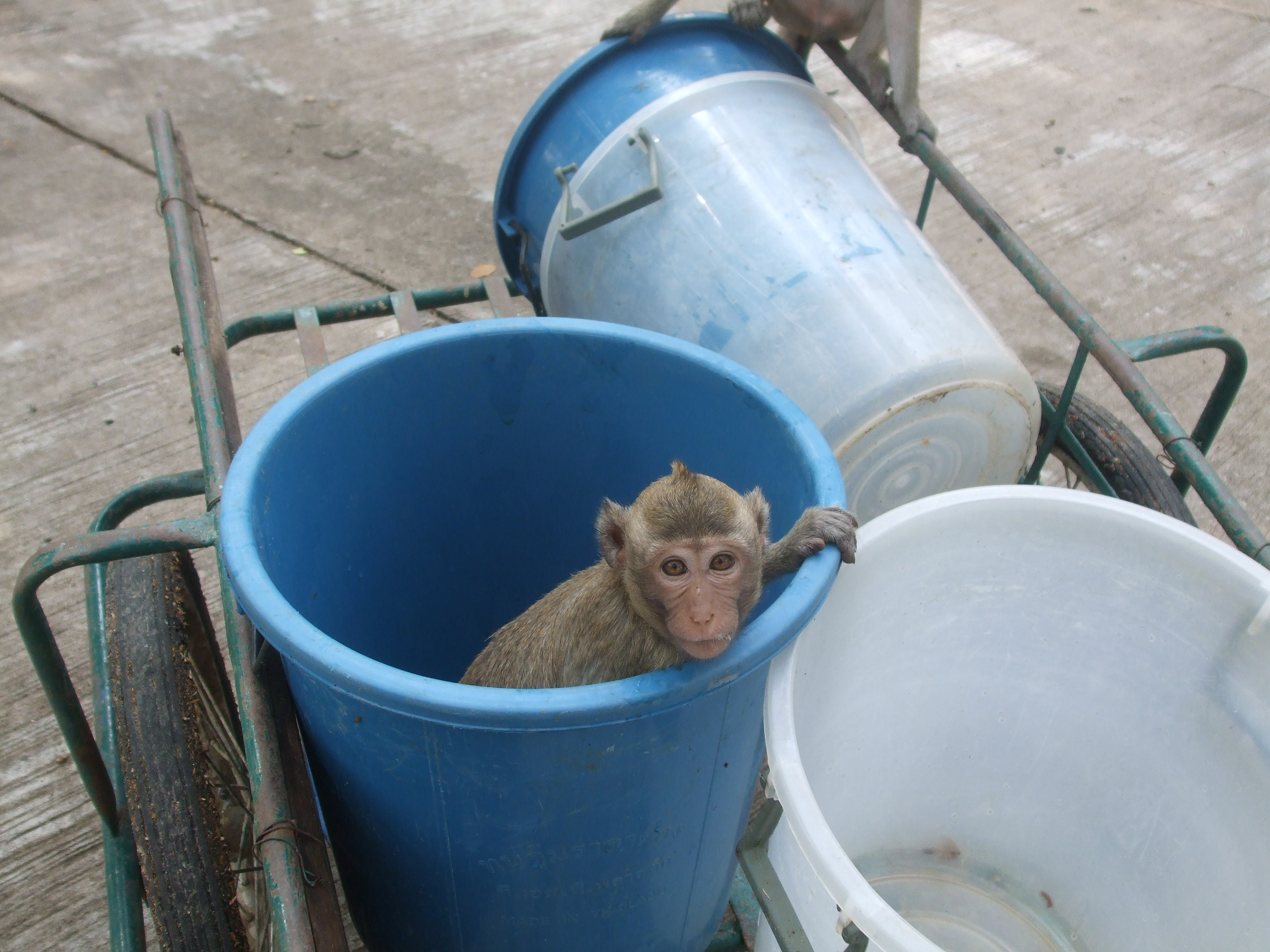 Our system for providing water is that we fill dustbins with water and load them onto a push-cart and deliver the water to 8 tubs made from recycled truck tyres which we have put in strategic locations about the forest. Here is a monkey drinking from one of them: