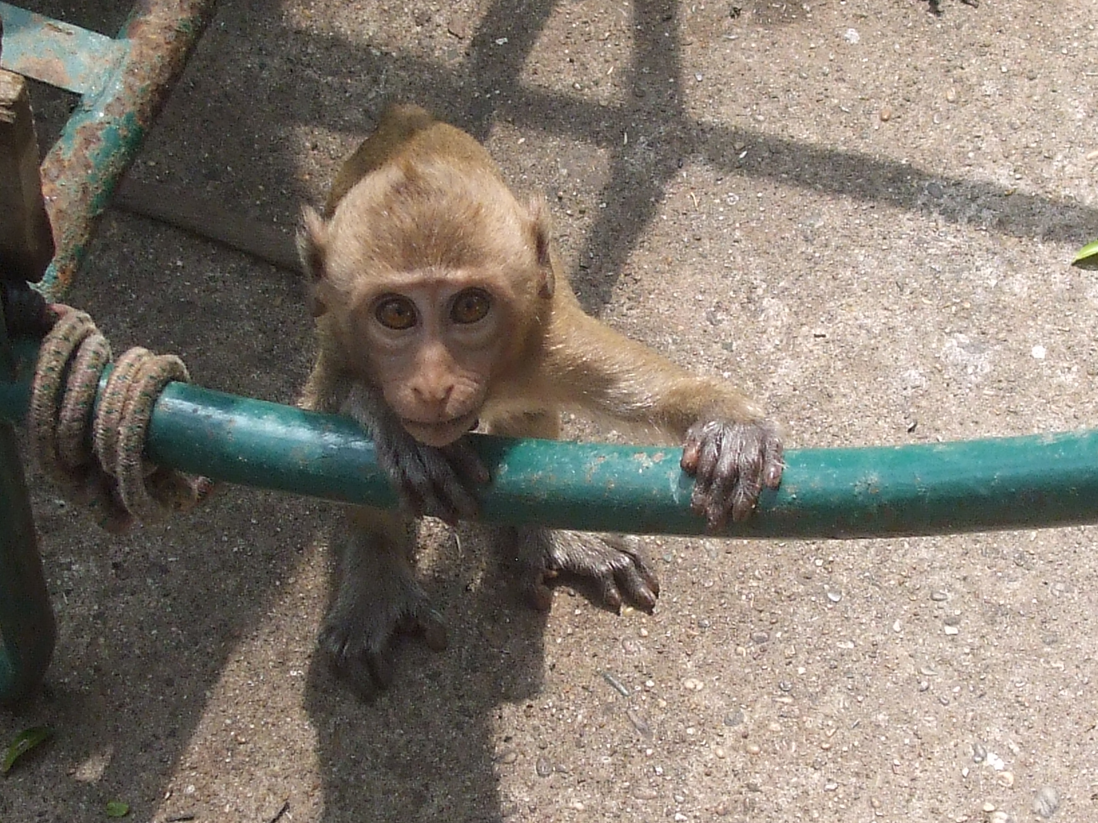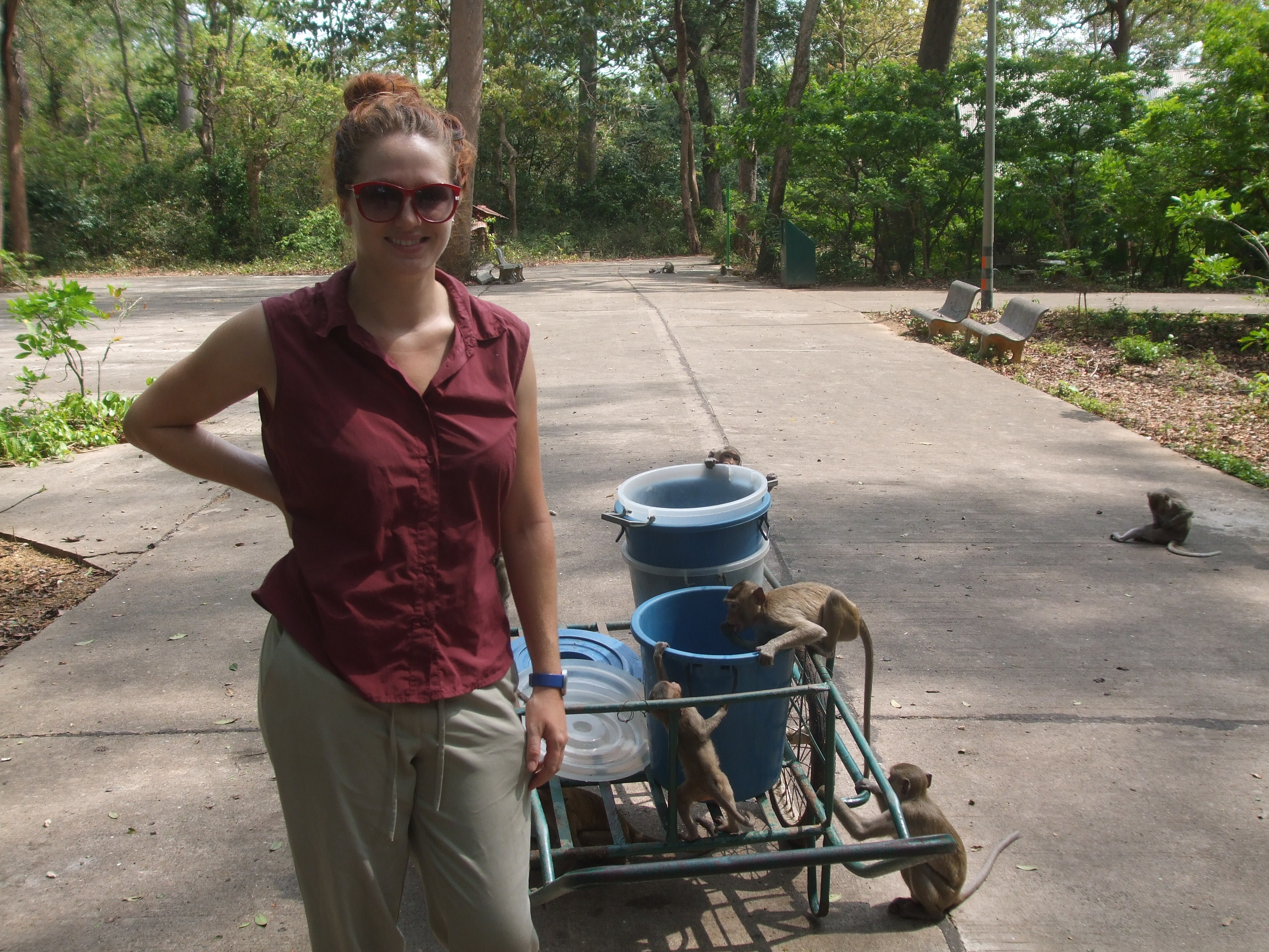 While Elizabeth is distracted by the photo opportunity, the monkeys take advantage of the parked push-cart.